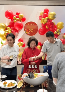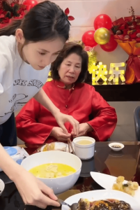 秋瓷炫则用“中国好儿媳”的行动,诠释了亲情的真谛。于晓光妈妈71岁生日时,她提前半个月策划派对,亲自布置场地,给婆婆挑了红色羊绒衫,还学会了做东北锅包肉。合照里她不停给婆婆夹菜,一口一个“妈妈”喊得亲切,婆婆则拉着她的手絮絮叨叨,完全不像婆媳,更像母女。她曾在采访中说:“公婆把我当女儿,我也要把他们当亲爸妈,这才是家人。”
