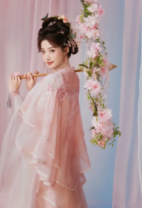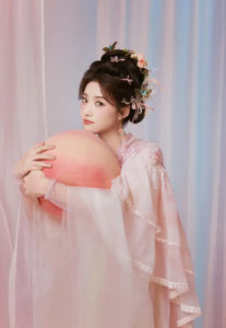粉色在中式美学中,从来都有着丰富的文化内涵。古人称这种粉为 “妃色”,源自宫廷的高贵气质,象征着温柔而坚定的力量。它不是西方粉红的甜腻,而是像桃花初绽时的第一抹红,带着含蓄暖意;又似晓霞初染的天光,柔和却有力量。从《诗经》中的 “桃之夭夭,灼灼其华” 到唐代杨贵妃偏爱的杨妃色,粉色始终与青春、浪漫、吉祥紧密相连,是刻在中国人基因里的审美密码。卢昱晓的粉色襦裙选用的正是这种经典妃色,恰到好处的饱和度,既符合当代审美,又延续了传统色彩的雅致韵味。