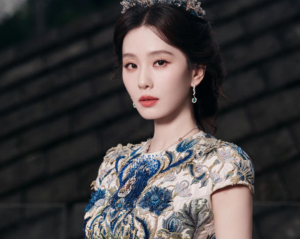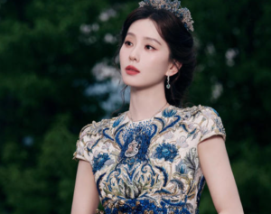 细节处的设计更是将《千里江山图》的山水意境与东方服饰美学完美融合。礼服上的刺绣纹样并非简单堆砌,而是提取了画作中山水、花卉、亭台的核心元素,金线勾勒的山峦脉络细腻流畅,与画中披麻皴技法如出一辙;花卉刺绣则借鉴了画中草木的灵动姿态,与石青、石绿颜料晕染的肌理相得益彰。裙摆处的蜂窝压褶设计,既保留了中式礼服的飘逸感,又复刻了《千里江山图》中 “步移景异” 的散点透视意境,让每一处细节都暗藏东方画理。搭配的非遗银花丝头饰,采用成都银花丝工艺,以细如发丝的银丝手工掐制出龙葵公主的经典纹样,蓝玉色泽与绿松石点缀,恰好呼应了画作中石青与绿松石的配色,成为连接造型与千年文脉的点睛之笔。